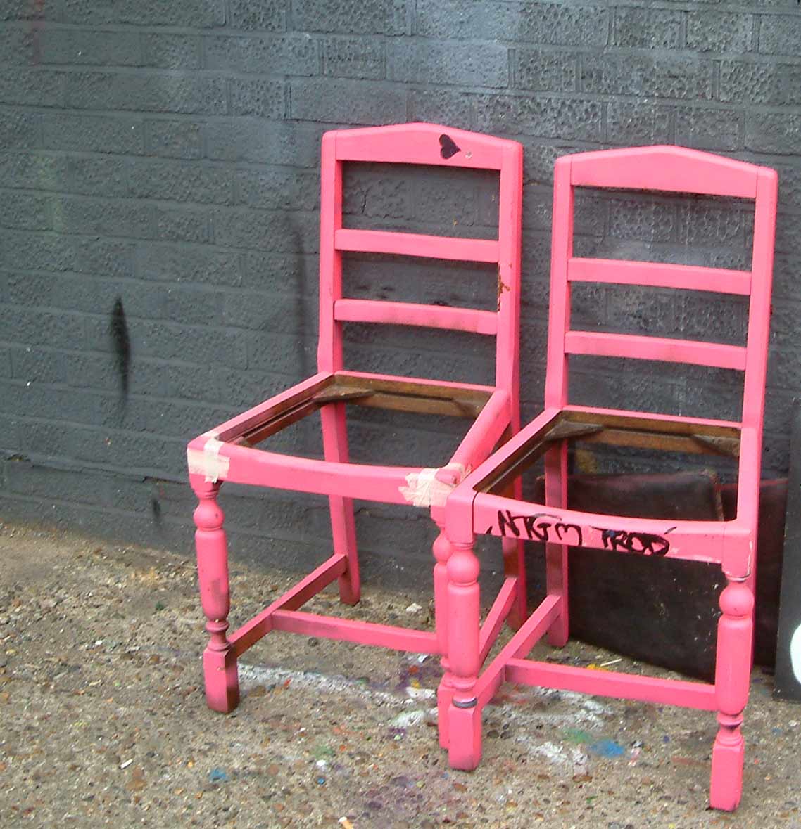 So there the chairs were, with their “NTGM Prod” black marker-pen tag on the front and their pink legs all falling apart, the unwanted bones of broken chairs, joints broken, chairs that have already been through a couple of life-cycles by the looks of things.