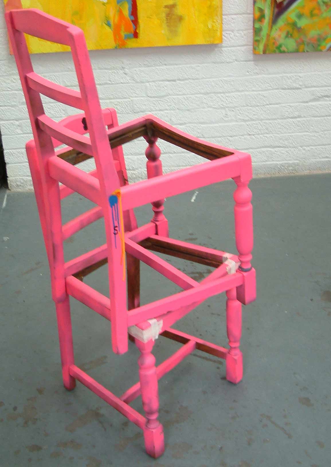 Not that “When do two broken vividly-painted pink chairs stacked on top of each other and placed in an art gallery become art?” is a particularly new question. No, not a new question, but it did deserved to be asked today, well I wanted to ask it. So they were carefully placed on top of each other in the middle of the gallery floor. And people started looking at them, circling around them, admiring them, asking who’s work they were, debating them. I resisted joining in most of the debate, more interesting to ‘invisibly’ listen. I told one man the piece had been placed there by Sean Worrall, he wrote the name down in his note book, checked the spelling and took several photos.