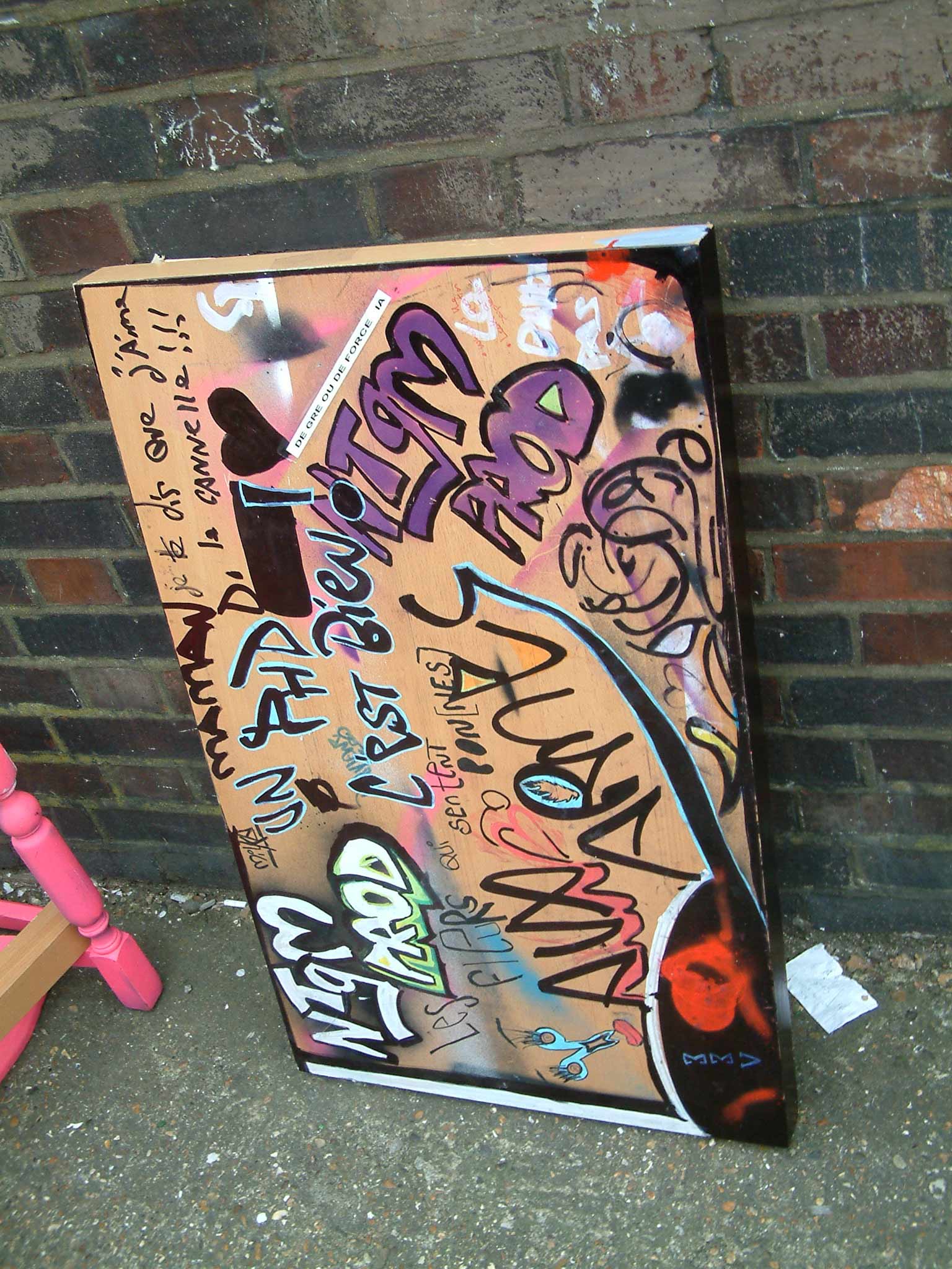 Saw something pink in the distance on Mowlem Street, turned out to be two rather vividly hand-painted broken chairs, a broken dining room table with some half formed graff on one of the leaves and another broken coffee table that looked far more interesting in terms of the art and the (French) marks on the top..