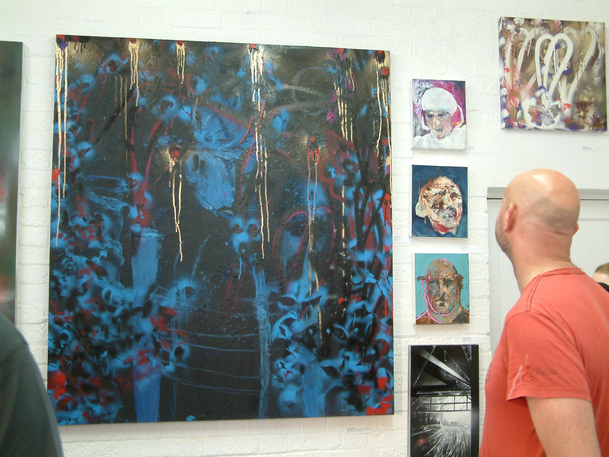 “Mowlem Street; If You Leave It Out The Leaves Will Grow” Acrylic, spray paint on used canvas, left in the Art Depository, then painted on and shown in the Deep Purple group show at Cultivate You’ll find a million and one photos of all these events via the photo albums on the Cultivate Facebook page… I will catch up with all the words soon, the Art Car Boot fair was great fun, the Apple Cart was an adventure and the shows at Cultivate have been really flowing… This big red canvas here was one I painted a new layer on in the run up to the Art Depository show. I have been painting layers of leaves and such on this canvas since it was first rescued, complete with scorch marks from the bonfire it was just about to go on, back at the end of 2010. In fact I entered 2011 painting that previously yellow eight foot tall canvas with a layer of green leaves while a New Years Eve party raged in the studio next door and I listened to Crass very loudly in here while party people watched and talked (I do like to enter a new year with paint brush in hand, this year it was the threesome of black paintings that took me in to 2012 while next door another new years party raged and more drunk people watched on . The now big red piece has been unfinished in my studio ever since that party a year and a half ago, well some might have said it was finished with the big spine of green leaves spiraling down it but for me it never was in any kind of finished state. The Sunday before my solo depository show opened, I took the then big green leaf-covered canvas, alongside a found half-full pot of red emulsion paint, down to the gallery and worked on it outside on the pavement while I looked after the final days of the Little Summer Benefits show. The new set of big bold black leaves grew on it as the red paint was poured and then scraped back off. Meanwhile the other photo, the big black and blue canvas, that is now featuring in the current Deep Purple show, was completed on the last day of the Depository show, it was left outside on the Saturday afternoon and then painted on on the Sunday and Monday outside the gallery. Do really need to write properly about the Depository and all the reactions while it all still fresh in my head, that and the adventures with the Art Car Boot Fair and such, for now this is just a 1.00am Sunday morning catch up, a brief few words and some photos of recent events… Sleep is needed, another busy day awaits tomorrow..