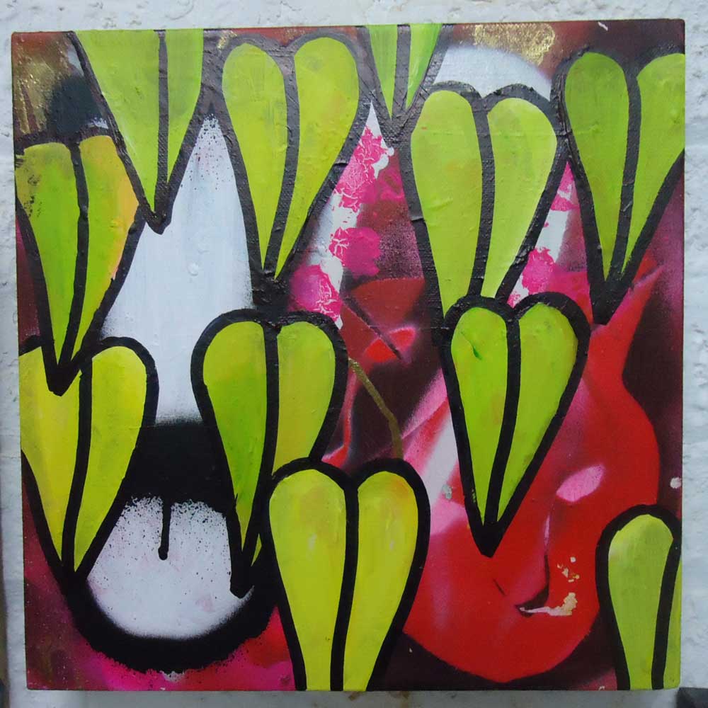 New paintings, new layers on old paintings…. a piece is never finished until someone takes it away. if they stay around here them the likelihood is leaves and such will grow on them. These freshly evolved pieces were all worked on in the first two weeks of January and are currently to be seen on the wall at Cultivate, or in some cases, to be found via the on-line shop….