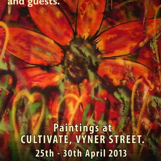 FIRST SATURDAY – The first Vyner Street First Saturday, an all day event on Saturday March 1st starting at 10am and going on until 11pm, with lots of galleries, art spaces, studios and cage in Vyner Street open and putting on events throughout the day. At CULTIVATE EVOLVED I shall be making paintings of pints of Guinness, they will cost you a pint of Guinness from the Victory pub, over the road… at some point I may paint a cheese roll or a bag of crisps. All my recent 2014 canvas pieces will be on sale for just £10 for the one day only, vinyl will also be vinyl being painted on all day.