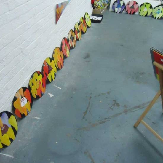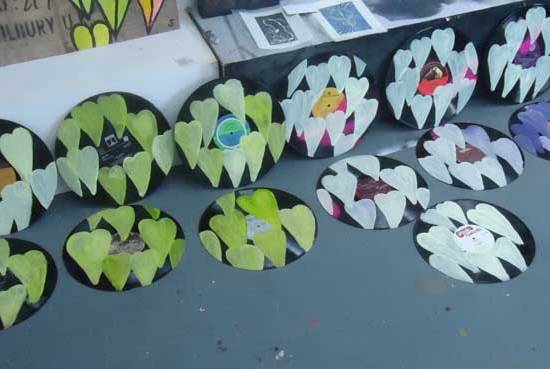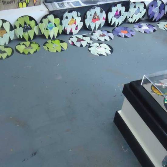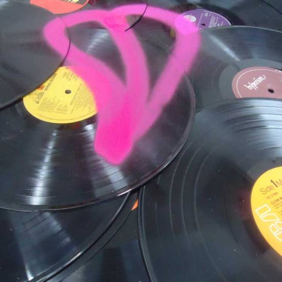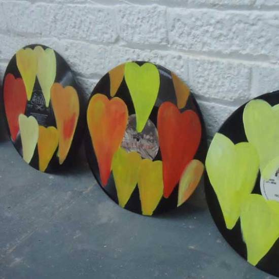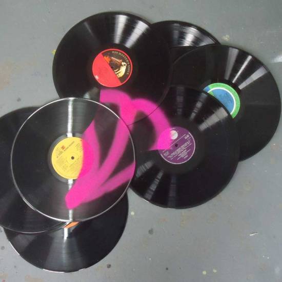 Time for another One Hundred Pieced piece, THE 100 PIECED VINYL PIECE – A piece of work that will, this time, consist of 100 pieces of unwanted/recycled 12″ vinyl. A piece that will be on sale (in 100 parts) at the 2014 Brick Lane Art Car Boot Fair (East London) on June 8th (in 50 days time). Work has started on the on the one hundred pieces, all will be painted at the same time (as the hundred pieced cardboard pieces were last year)