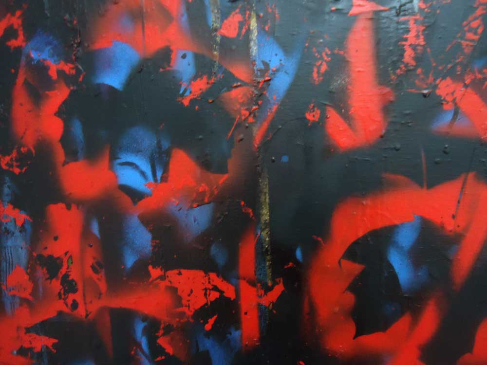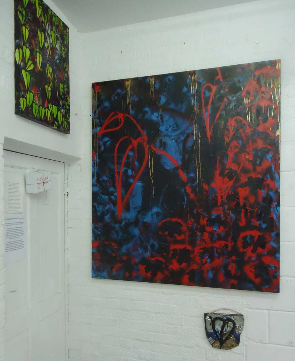 Woke up earlier this week thinking thinking it was about time a red layer was cultivated on the large black and blue canvas piece I still have in the studio, a piece is never finished until someone takes it away. And so it was dragged down to Vyner Street and a red layer of fresh growth was cultivate in time for the large piece of canvas to go up on the wall at Cultivate Gallery in time for last night’s May First Thursday late opening…..