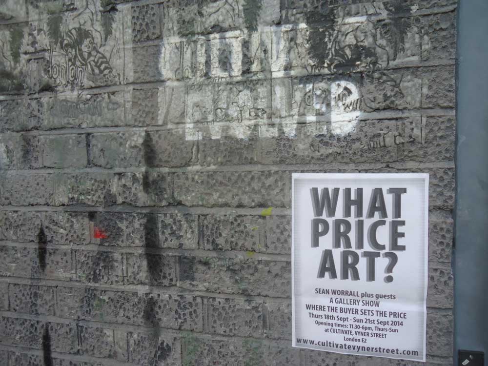 From Thursday 18th September until Sunday 21st September one half of the ever evolving art space called Cultivate will be devoted to another What Price Art event. For one last time in Vyner Street, Sean Worrall and a number of guests will show a selection of work, all work will be on sale, none of the pieces will be priced. Viewers can name their own price on any of the pieces, there will be no debate, whatever the viewer offers for a piece of work will be the price accepted and the viewer/buyer can take away the piece for the price they wish to pay.