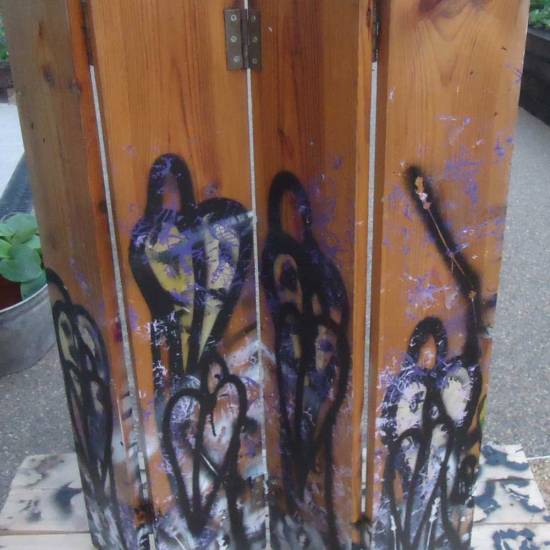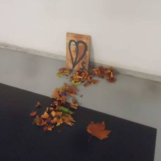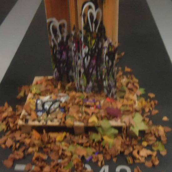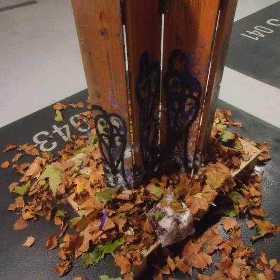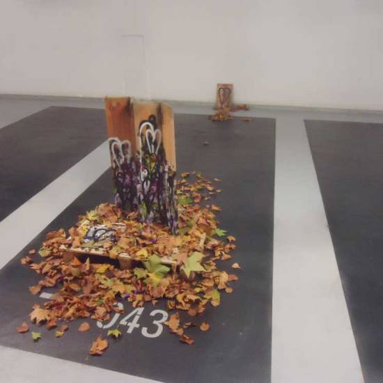 Why is the piece called Emma Street E2? Because the original hinged together wooden screen was found last month on a pile of thrown out rubbish thrown against a wall in Emma Street, Hackney, London, E2. Piece of leaf growth have been appearing on the beautifully weathered pieces of wood over the last month, some intense growing and cultivating of leaves on the piece that is now standing on a packing case and installed in the car park in central London. The evolution of the piece is documented further down this blog, I expect it will continue to evolve after this show, a piece is never finished until someone takes it away.