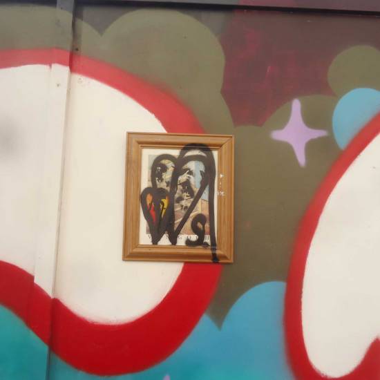 The adventure of #365ArtDrops number 22 so far…. A rather cheap and tatty Van Goch print was found sometime last year, can’t actually remember where now, spotted in a skip or something along those lines. The rather vulgar framed print had been sitting in the corner of the studio with all the other bits of junk picked up to recycle, reuse and paint on (there’s bits of old skateboards, frames, interesting cardboard, vinyl records, canvas pieces, high heeled shoes). Spray painted a very simple black leaf (some may see hearts, I see leaves, who is to say?), painted a little more, another crude tag-like leaf (some of the pieces will be crudely painted with little more that a simple bit of spray paint, others will be worked on again again, hours of work, both as valid as each other). And so piece number 22 was painted and ready to go out. I wrote on the back and put it in the bag, in the bag with nine other pieces last Saturday morning.