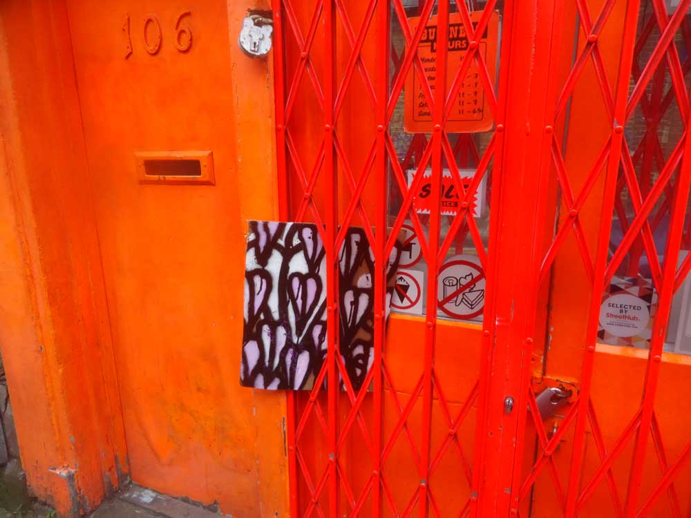 #365ArtDrops – this relatively big cardboard piece was left on Redchurch Street last Thursday evening, it needed to be rescued from where it had fallen when I went past on Saturday morning, rescued and put back out today in a deliciously orange place – today being Saturday Feb 7th.. Passed another one as it was being photographed by tourists, another one of those street art tours. 38 days in and 39 pieces left out so far, some of them fall by the wayside, some of them stay where they were put, some are taken, never to be heard of again and some we find out about. hearing about where they’ve gone is very much part of this piece, we’re hearing about around a quarter of them right now, thanks people….