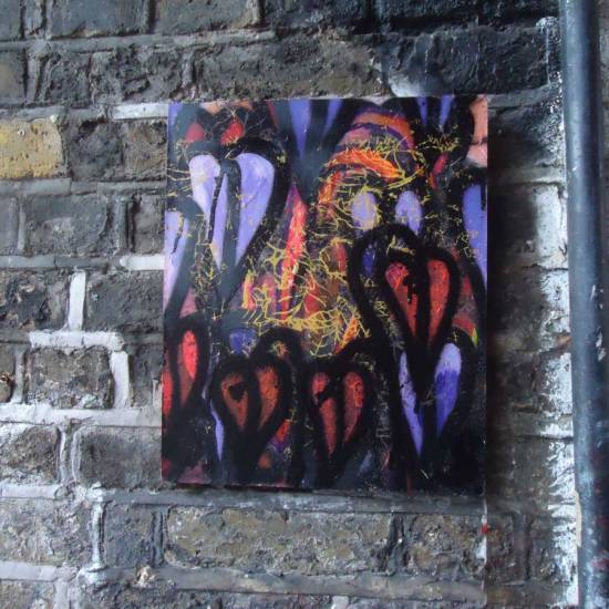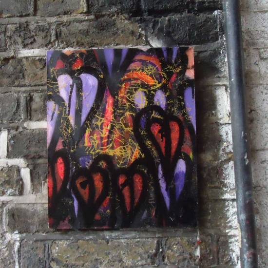 The continued adventure that is the piece of work called #365ArtDrops in which 365 paintings, paintings on things found on the street, painted on and then put back out on the street. The adventured continued today with part 40, 41 and 42 left out around East London, Part 40 was painted on a piece of hardboard found left outside a woodwork workshop in Vyner Street, part 41 and 42 were found left on the pavement outside an artist’s studio at Space, Mare Street. All three pieces went out this morning….