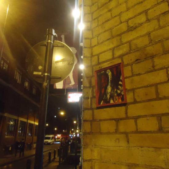 52 have now gone out since this thing started on the spur of moment on New Year’s Day. We don’t know what has happened to most of them, we know some have found new homes, we know one or two are still where they were left, we know one is in the USA, two in Israel, a couple in Sydenham, one in Oxford, two or three are now indoors on people’s walls in East London homes, one over in West London. So far there has been paintings on found pieces of cardboard, on pieces of wood thrown out of other artist’s studios, on old canvas paintings found in skips, on vinyl records, there’s been pieces put in recycled frames that people have abandoned, there’s a couple of beer bottles that are currently being painted on…. 52 done, 313 to go before this year-long piece of work is complete…