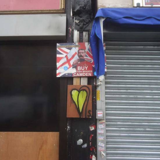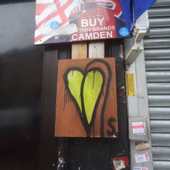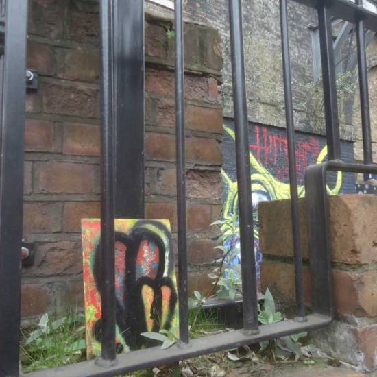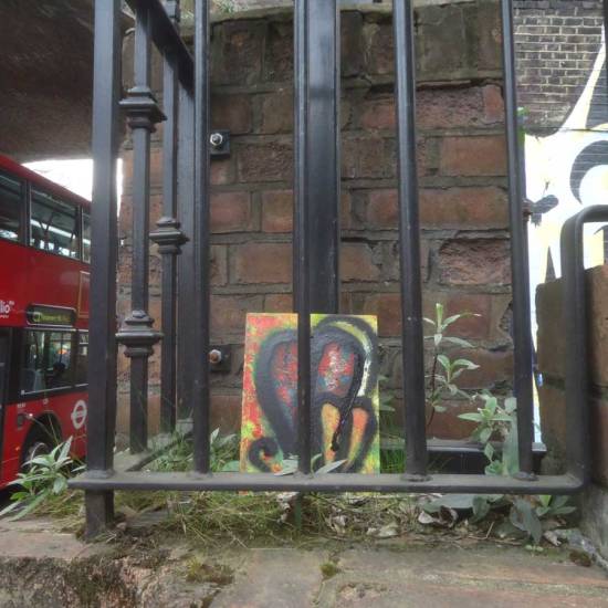 Part 59, 60, 61 and 62 of the pieces that make up the #365ArtDrops were left on Camden, Hackney, Camden once more, and Kentish Town, three of them painted on pieces of hardwood picked up from the rubbish pile outside of an art studio on the Mare Street pavement, London E8, the fourth on a the backing board from a broken picture frame. The two Camden pieces were left hanging on the now closed down shops of the market that is now scheduled to be destroyed. Yet more property development….