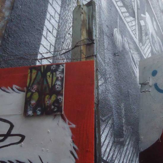 On with the #365ArtDrops piece, part 66 through to part 74 went out this week, most of them last night around East London…. Pieces painted on found bits of cardboard, one of the boards that were part of the Mind The Gap piece over in Tooting last weekend, a generic shop-bought framed piece I found on the street sometime last year, a paper bag that came with a bit of recent shopping, a couple of pieces of hardboard picked up from the street. Part 66 and 67 were quietly left on the floor in the room at the Broadway Studios event last weekend. 74 drops in now, on the piece goes today with part 75…. here’s the latest photos