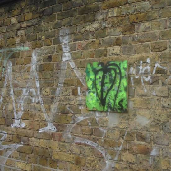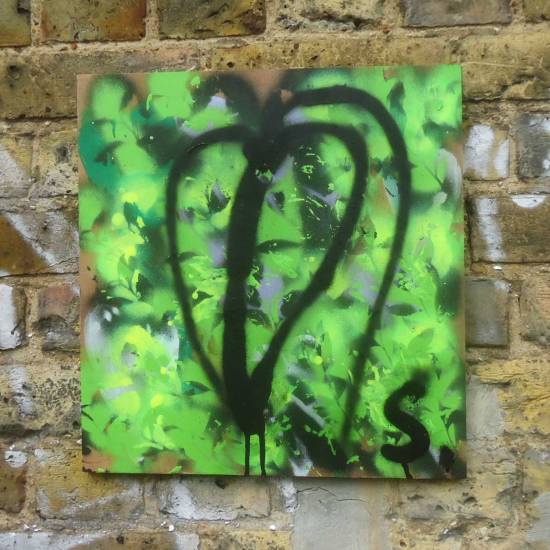 Bethnal Green, East London, May 1st 2015 #365ArtDrops part 100, painted on a found piece of hardboard and left hanging on a wall down by the lock house next the canal. Keeping a fading piece of Burning Candy company until someone takes it