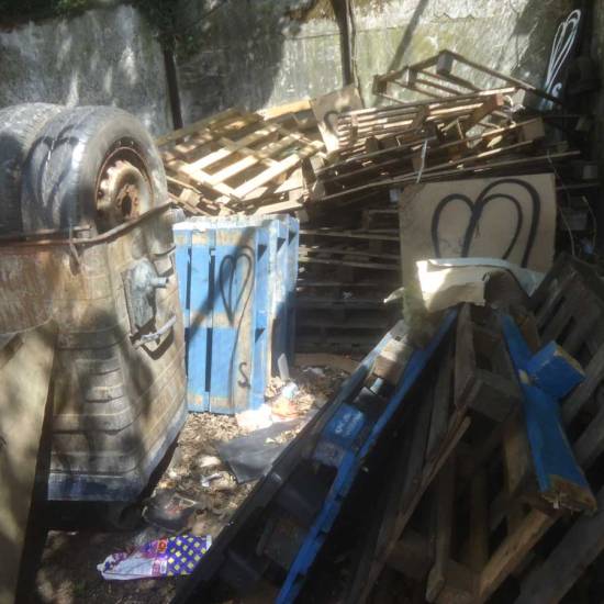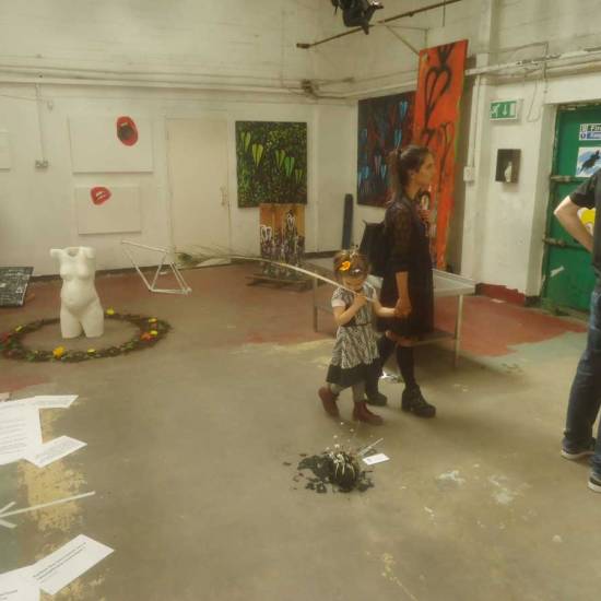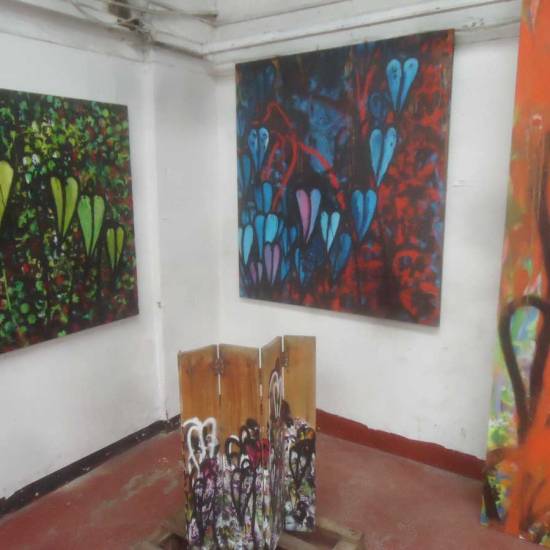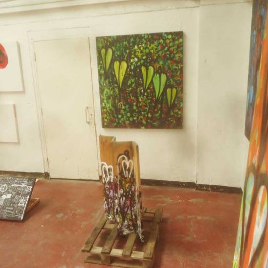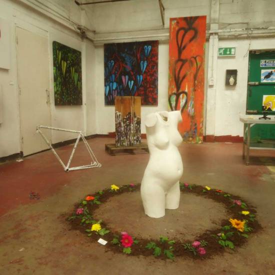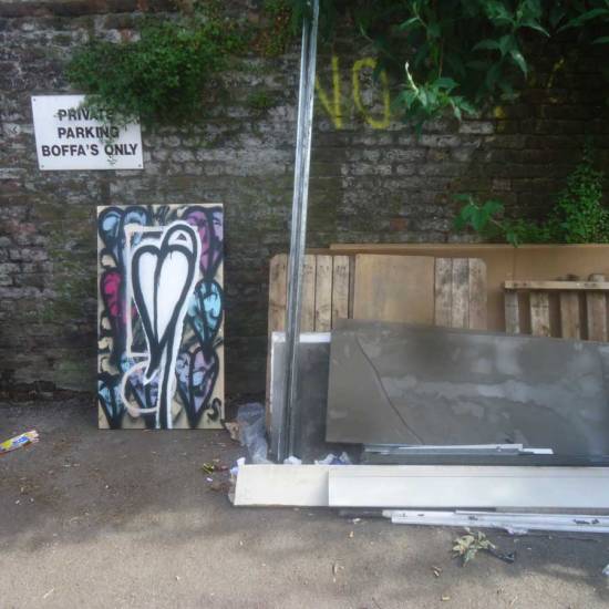 It all happened one minute from London Fields railway station and right by Broadway Market, by the park itself (and all that that involves on a summer weekend). The plan was a very busy two day art exhibition, a place to Play, artists coming together and doing it ourselves, doing it in a great big warehouse (guarded by a Burning Candy cat and sweet set of teeth, 2010 vintage rather then the fangs of now). We wanted to bring an unwanted building to life again, walls and floors alive with paintings, with sculpture, installation and more, street artists jousting with contemporary painters, sculptors juggling around installations, performance next to leaf growth, next to Emma Harvey’s bold red mouths or Julia Maddison’s Our Lady of The Chip Shop or the big banners of Danny Pockets … A two day art show in a great big beautiful shell of a (soon to be demolished) warehouse. A gathering of pro-active artists who had either exhibited work with is at Cultivate during the three year Vyner Street period or worked alongside us at other events in recent times. We were being very picky about who we invited to take part, we wanted the show to be balanced and considered, very much a curated thought out exhibition rather than a chaotic free for all, we wanted the exhibition to flow, you work as one whole, we wanted the black and white illustration of Mille Easton or Phillip Hawkey next to the intrigue of samuel Brzeski or India Roper Evans – but this was essentially artists coming together for a DIY punk rock style weekend art exhibition in a disused East London warehouse.. Egos and attitudes left at home, artists coming together to make something happen, a busy show, maximalism in the ruins of the fast disappearing East London playground and everyone is invited to come have a look and explore the walls and floors, explore the art and the people making it… more over on the Organ pages