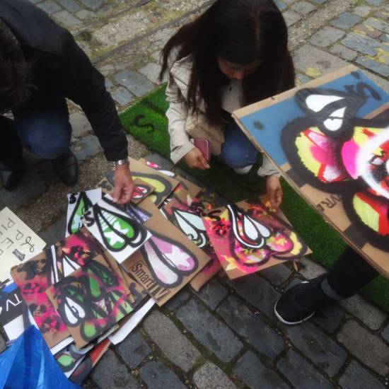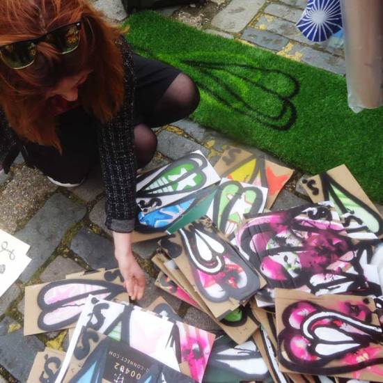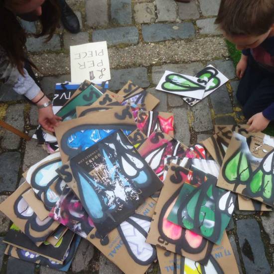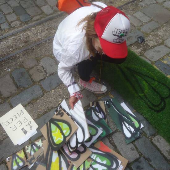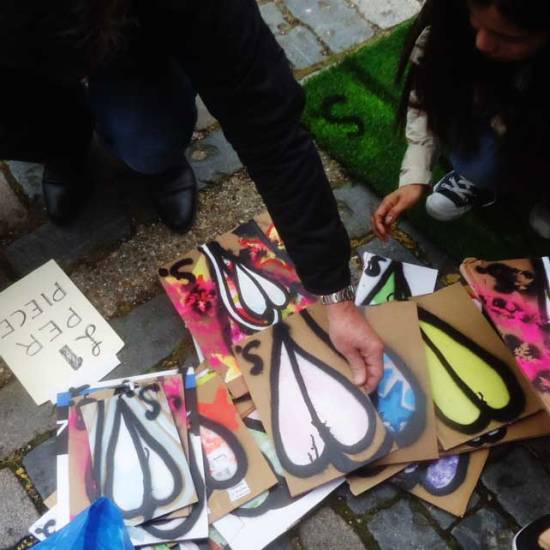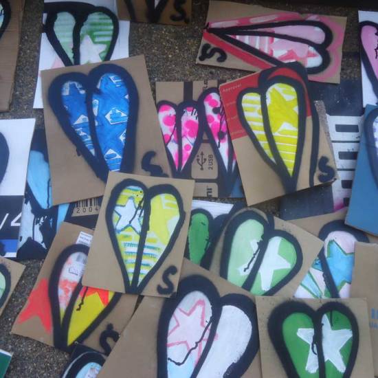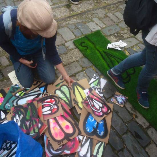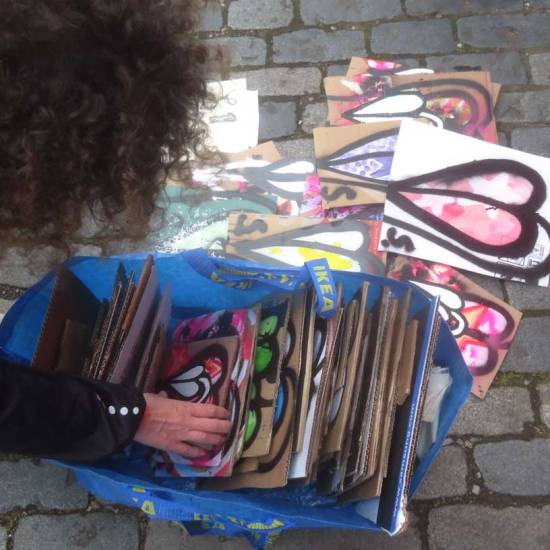 The 6th One Hundred Pieced Piece, a piece of work in one hundred parts, painted on one hundred pieces of recycled cardboard. All painted with the Brick Lane Art Car Boot Fir in mind One piece of work consisting of one hundred pieces, each hand painted with both brush and spray paint on one hundred pieces of recycled cardboard at the same time, Each piece on sale at £1 at the 2015 Brick Lane Art Car Boot Fair, East London, on Sunday June 14th.