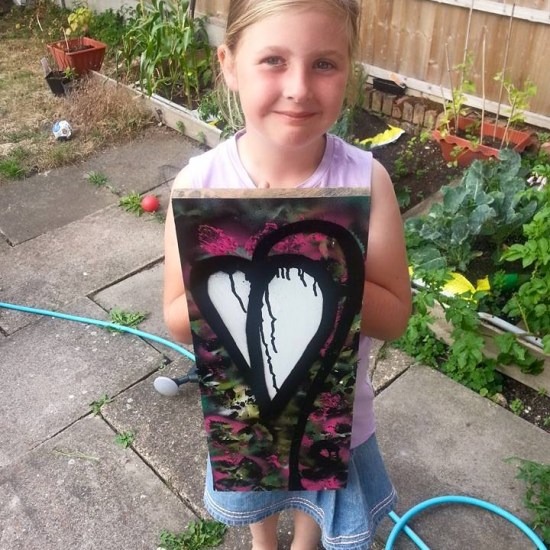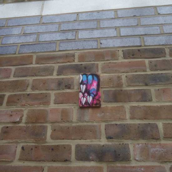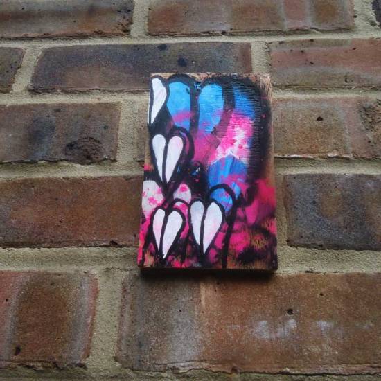 The painting hung under bridge last week (see previous entry) turned up in a garden somewhere in England, meanwhile part 182 of the #365ArtDrops piece was painted on a small piece of wood, an off-cut picked up from the rubble of an East London building site. The piece of wood was painted on again and again for a couple of weeks, painted on, and then left hanging yesterday afternoon on the wall of a building on Ezra Street, London E2. It wasn’t there long, the photos of the finder appeared on social media about an hour later. People interacting is such an important part of this on-going year-long piece of work…