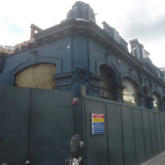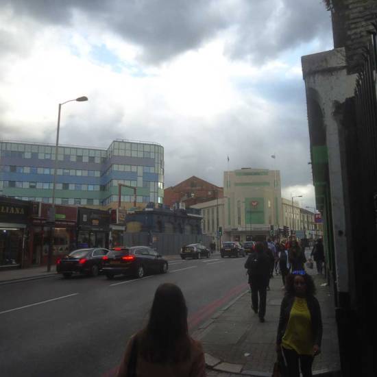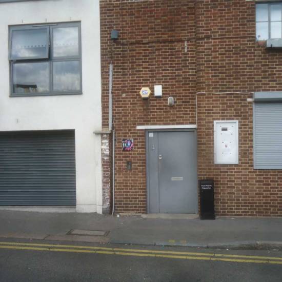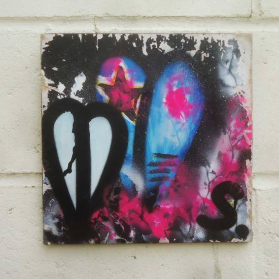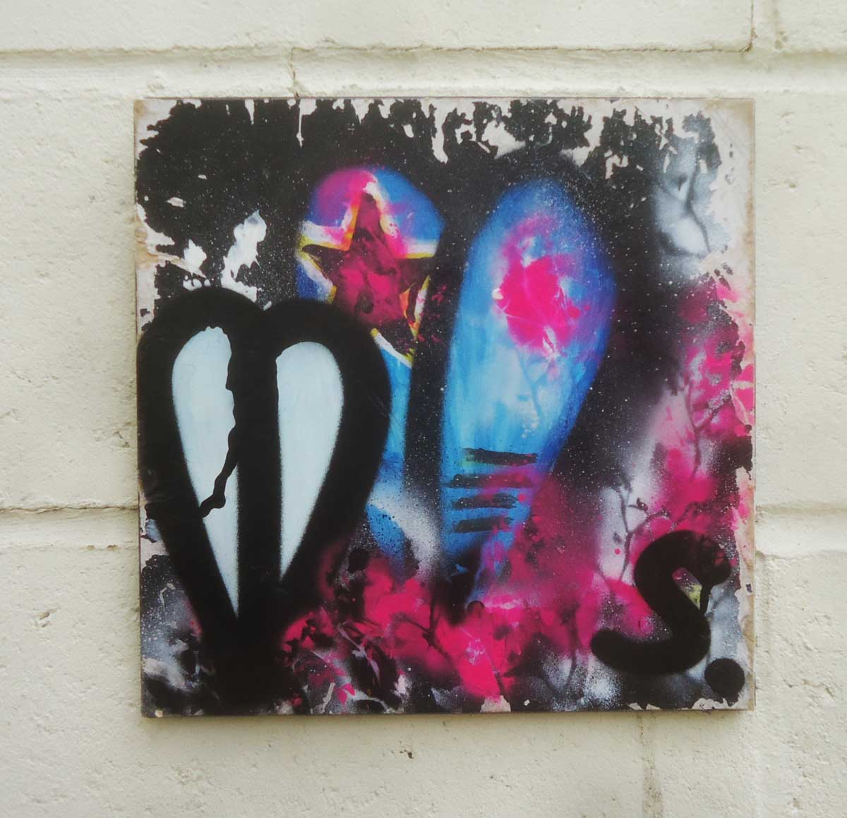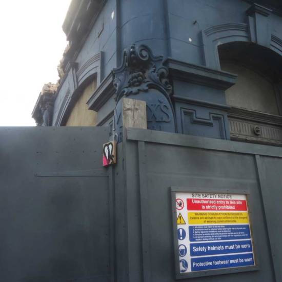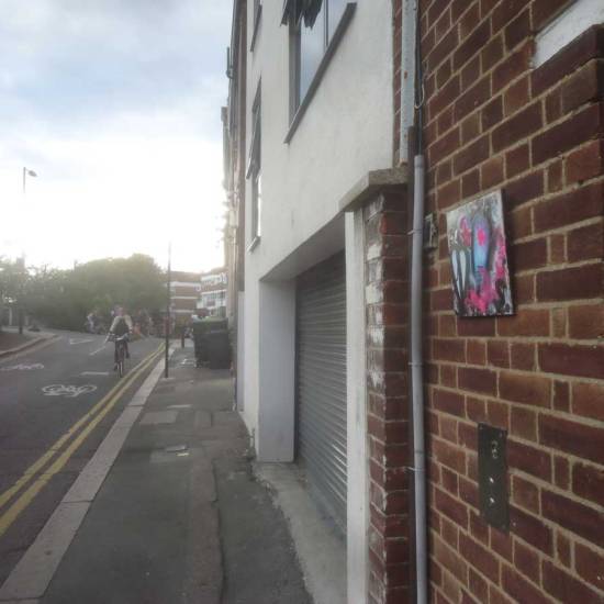 #365ArtDrops Part 184, painted on a found piece of hardboard picked up off a building site and left hanging by the ruins of one of London’s finest music venues, The George Robey, Finsbury Park , North London – July 28th