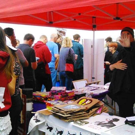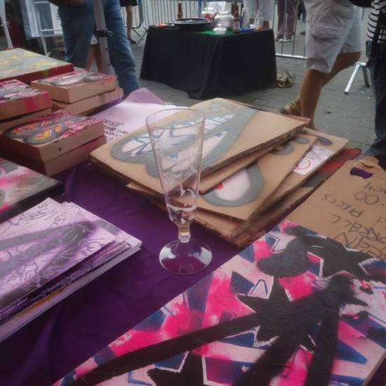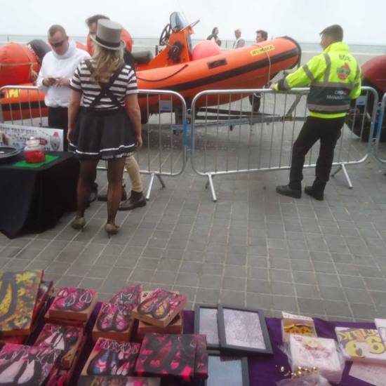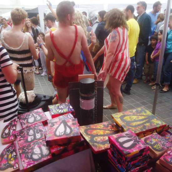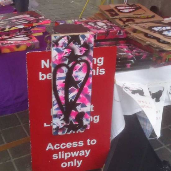 Down to Margate, 2015 Art Car Boot Fair at the Turner Contemporary…. The second leg of the 2015 Art Cart Boot Fair happened at the Turner Contemporary on the seafront of Margate on August bank holiday Sunday (August 30th). . We were invited to take part once more, fifth year, always a great day, contemporary art smiling for a day, hair let down, people, chat, familiar faces, fun. This time a 43 pieced cardboard piece, 43 pieces of cardboard painted at the same time, rather like the idea of a unique piece of hand made art, an actual painted rather than a print, being for sale at £1. All 43 pieces sold quickly (hopefully non of them get flipped on ebay). A bag load of affordable art and the first train out of East London, down to Margate for a day by the seaside, some art drops, some selling of very reasonably priced art. The whole thing, the photos of other artists involved, some words on the whole day and more can be found over on the Organ pages. Here’s a taste of my pieces, the stars, leaves, pieces painted on cardboard, blocks of recycled wood, small canvas pieces….