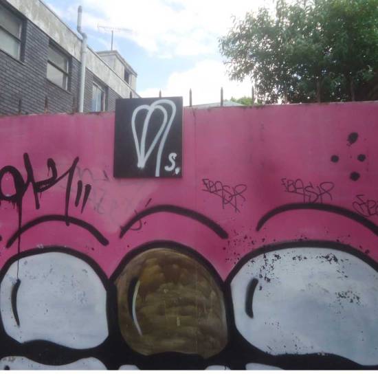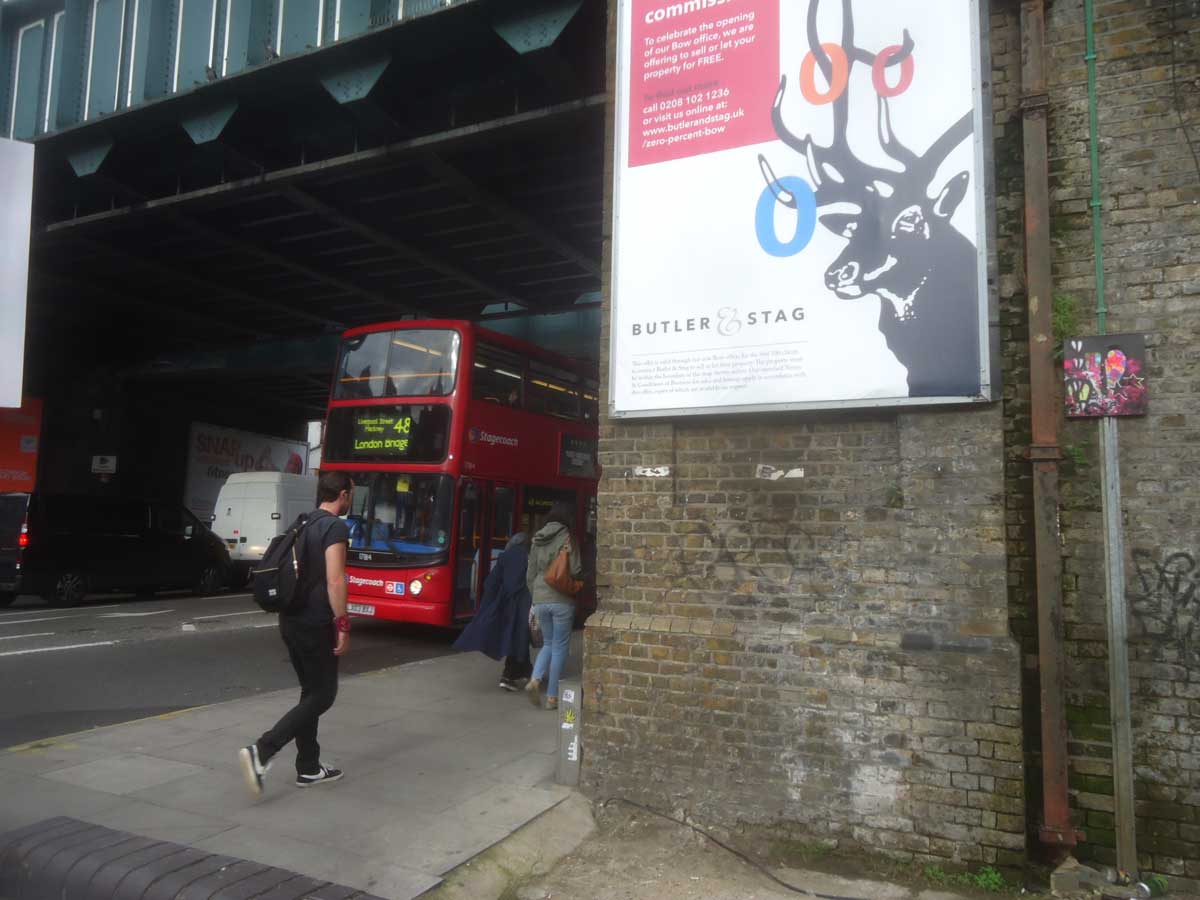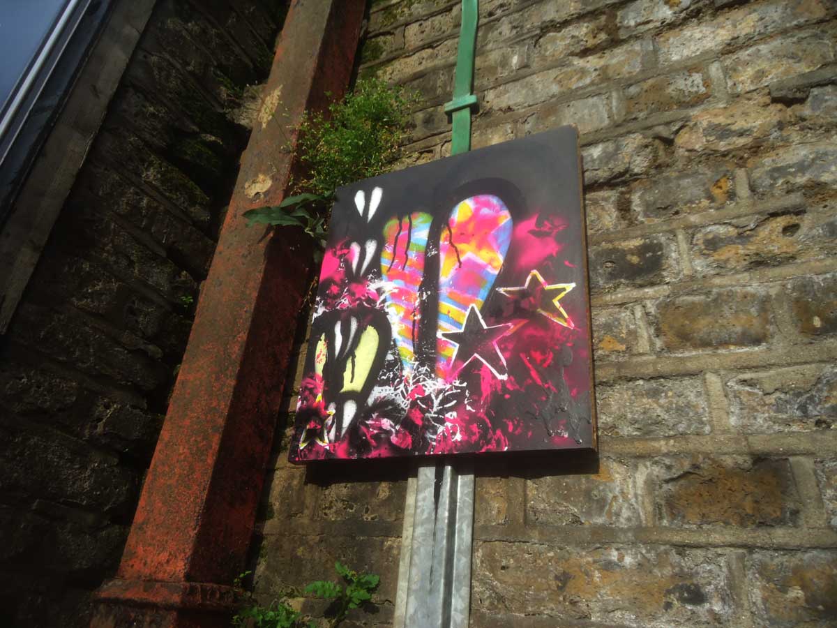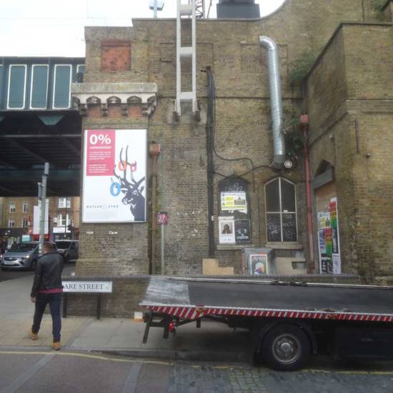 So the piece was retrieved, repainted, and last week rehung back out on the street, Bethnal Green this time, top of the ever evolving art-filled Clare Street. And there it hung throughout the weekend until some railway workers came along to repair the bridge yesterday. Will it survive? What will happen next? Who painted it black anyway? What was that about?