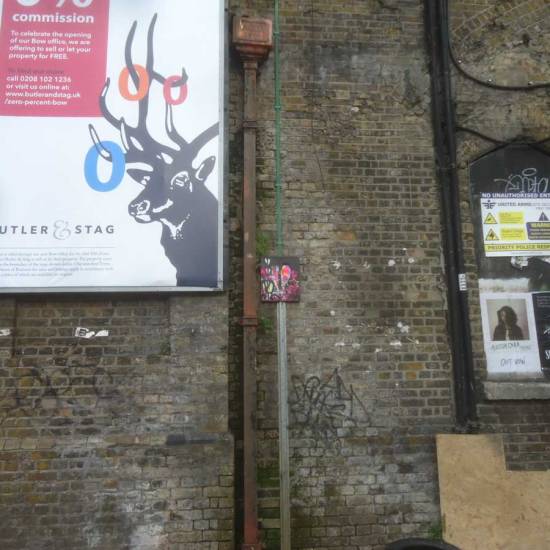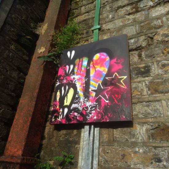 The (on-going) saga of part 131 of the #365ArtDrops piece. Part 131 was painted on a piece of hardboard found on a Hackney back street, one of three painted on what looked like one-time pieces of an Ikea-style book shelf, black shelves from a smashed up piece of furniture left on a Hackney street. Part 131 was painted on, hooks and strings were added, details stuck to the back of the piece, and off it went with about a dozen other numbered pieces that were hung out around Hackney Wick during the last weekend of June, off to hang on the streets during the Hackney WickEd weekend.