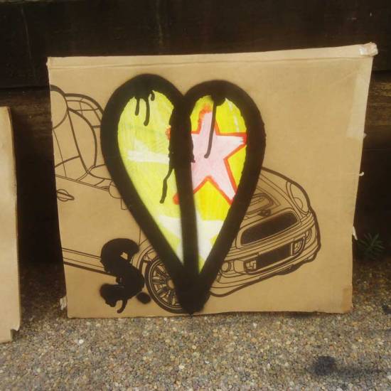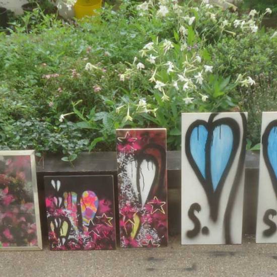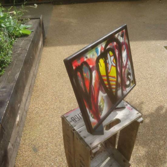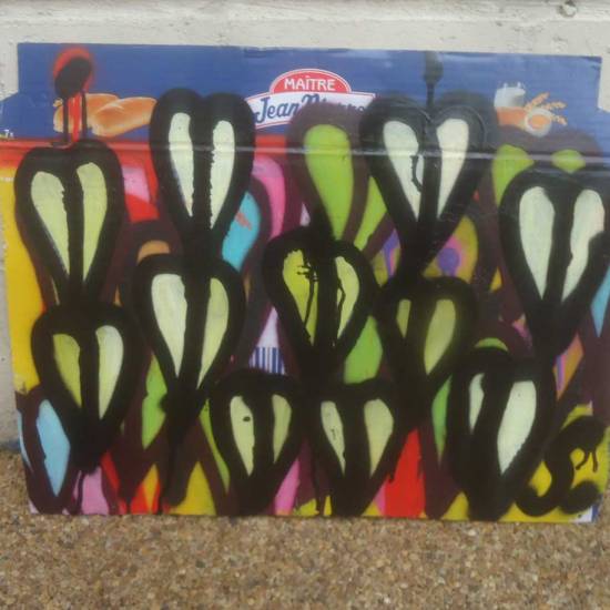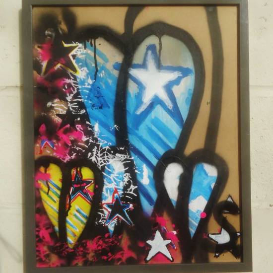 I was outside yesterday growing black and pink hop leaves on a found piece of marine plywood, I was working on another piece actually (there’s usually several pieces being painted on) when a passer by asked if that one was finished and could he buy it. It wasn’t finished at the time, he insisted it was we had quite a long friendly chat about it, as much as he wanted to, I wouldn’t let him take it, in my head it wasn’t finished. I know I keep saying a a piece is never finished but they do generally arrive in a state that I do consider finished, when a piece goes on a gallery wall (or out on the street) it is considered finished, but then if it does come back here to the studio new layers will eventually grow on it. Yesterday’s piece was simply work still in progress, it is finished now, Hopstarz, several layers of black, blue, red and white starz painted over the last few weeks and now underneath those pink and black hop leaves painted yesterday (those starz were always going to be underneath a layer of leaves) . I imagine it will be “dropped” next week, or taken to the next show and hung on a gallery wall with other starz and leaves and….