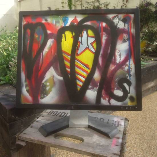 Found a flat screen computer monitor in the street sometime ago, been kicking around here in the studio (with all the other found things waiting to be painted on), the monitor has been here for a couple of years picking up bits of leaf growth and such on it, a piece is never finished until someone takes it away. Dragged the monitor out and painted a fresh leaf on it this week, this one feels like it needs to be taken away now, or maybe plugged in and stood in a gallery on that 1960’s crate (eight shilling deposit so it says on the side, found the crate on the street as well). I never consider a piece finished until it is taken away, if a piece stays around here then leaves and such will grow, new layers, ever evolving, never stopping, than monitor is finished (for now).