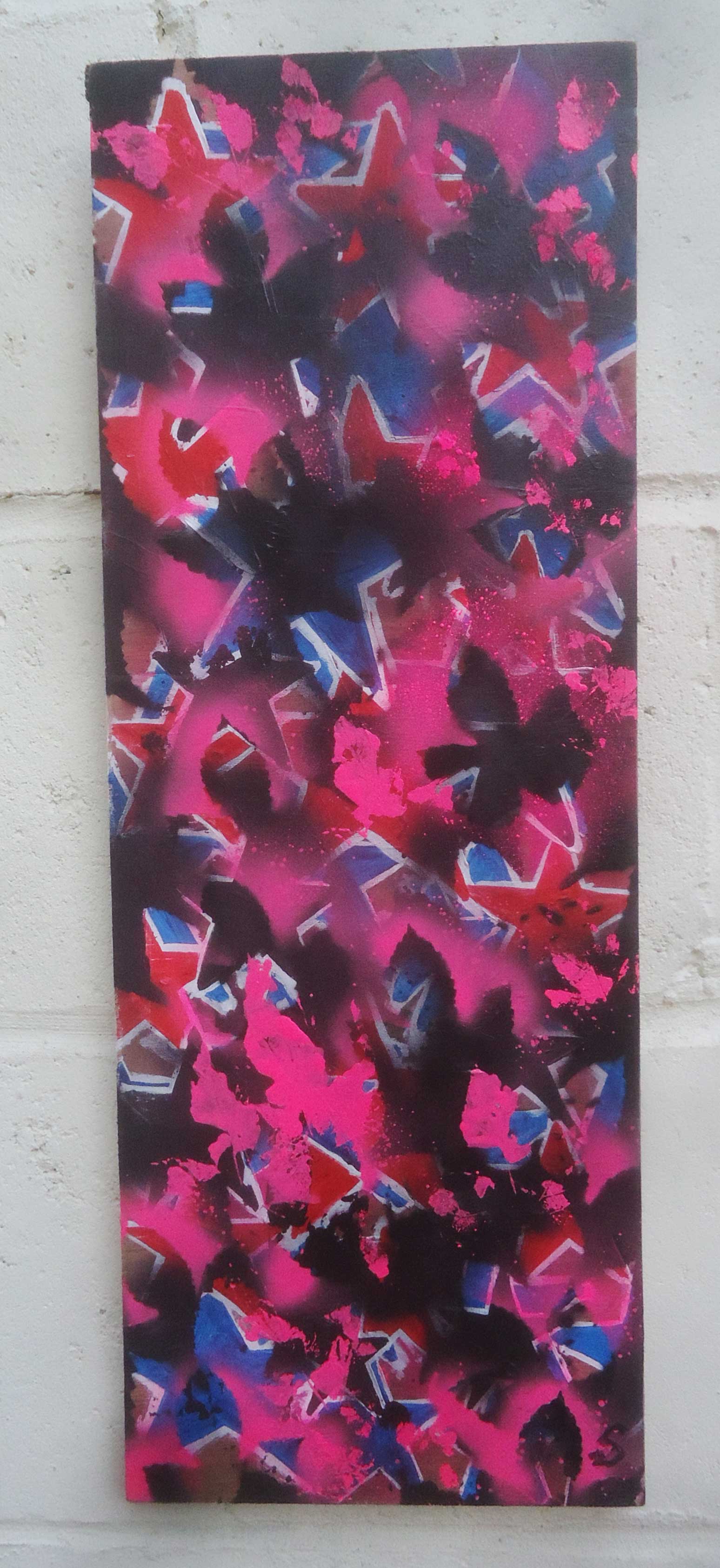 I was outside yesterday growing black and pink hop leaves on a found piece of marine plywood, I was working on another piece actually (there’s usually several pieces being painted on) when a passer by asked if that one was finished and could he buy it. It wasn’t finished at the time, he insisted it was we had quite a long friendly chat about it, as much as he wanted to, I wouldn’t let him take it, in my head it wasn’t finished. I know I keep saying a a piece is never finished but they do generally arrive in a state that I do consider finished, when a piece goes on a gallery wall (or out on the street) it is considered finished, but then if it does come back here to the studio new layers will eventually grow on it. Yesterday’s piece was simply work still in progress, it is finished now, Hopstarz, several layers of black, blue, red and white starz painted over the last few weeks and now underneath those pink and black hop leaves painted yesterday (those starz were always going to be underneath a layer of leaves) . I imagine it will be “dropped” next week, or taken to the next show and hung on a gallery wall with other starz and leaves and….