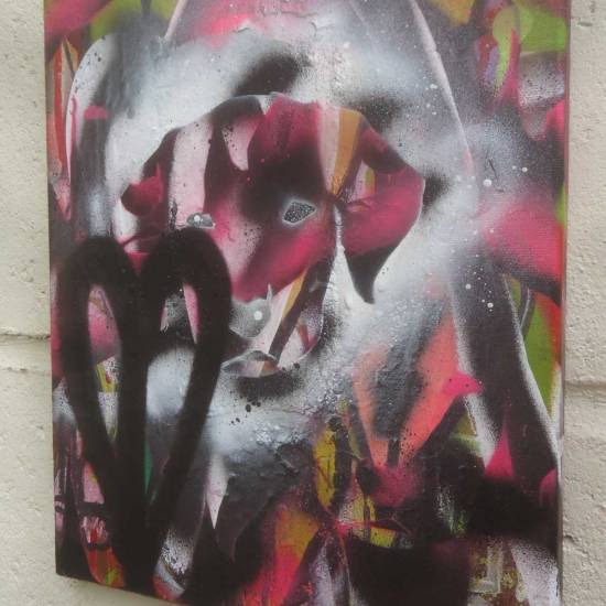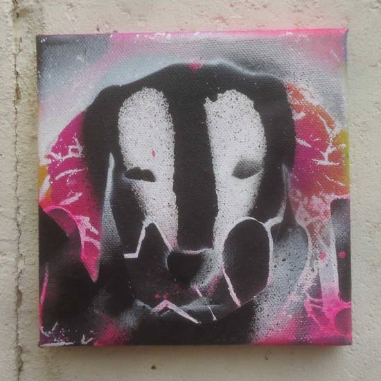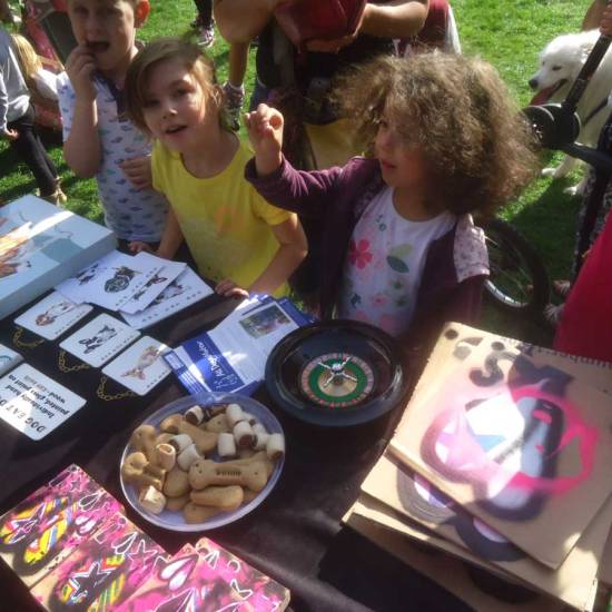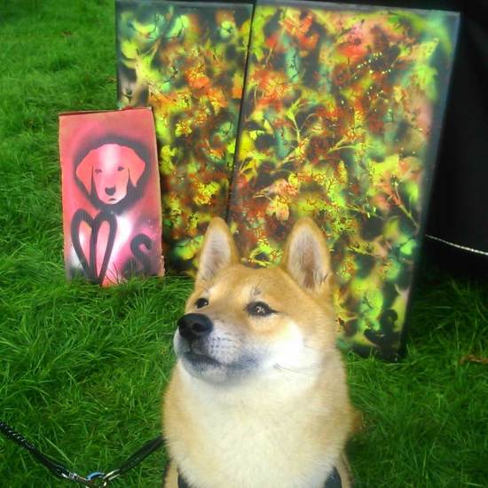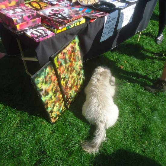 “Well we had a great time at the Victoria Park dog show yesterday. The invitation to take part was a follow up to our Cultivate collaborations (well mostly Emma Harvey’s collaborations) with All Dogs Matter for the dog-themed Brick Lane Art Car Boot Fair earlier this year. Yesterday we spent the day in the sunshine with a gazebo, a table full of art, a bag of dog biscuits, some spray cans, some recycled cardboard, and some recent canvas paintings. Good to get out of the art bubble and engage, and as brilliant as things like going to Margate or Liverpool or Folkestone with the Art Car Boot Fair is in terms of engaging and getting out of the gallery, it is still the art bubble. Yesterday was brilliant, yesterday was fun, yesterday was engaging with people in a different bubble, loads of good conversations, loads of good chat about how “oh art galleries aren’t for me, I don’t get all that stuff”, lots of dogs, lots of smiles and “what is that really about, I just don’t get it?”. Not for one second do we think art should be “dumbed down”, and yes, we love a white cube as much as anyone, but surely art really should engage now and again? Surely art should take a moment once in a while to reach beyond the various art crowds? The car park takeovers and the Chinese Opens and such are fine, surely it does sometimes need to reach beyond the insular feeling you get in those spaces though . We enjoyed yesterday, dog biscuit roulette is fun, dogs always liked coming in through our open Vyner street corner door, we loved taken it to the dogs yesterday, all dogs, and indeed all people, matter.”
