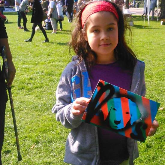 On with the carefully placing of the so called #365ArtDrops, never actually dropped of course, always carefully placed, stung and then hung. Part 217 of the 365 pieced piece of work was hung on a nail on a street corner on Brick Lane a week or so ago, painted on a piece of offcut garden decking and hung in the East End of London, the piece appeared on Twitter, in the hands of this little girl, via an art gallery in Margate. No idea how it got from the East End to a gallery in Margate, and of course, once I “drop” a piece it is not for me to say what happens, several have turned up on gallery walls now. Great photo of the finder of the piece…
