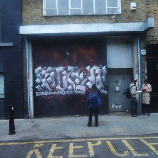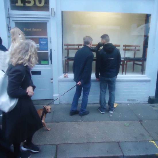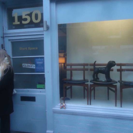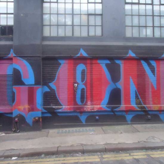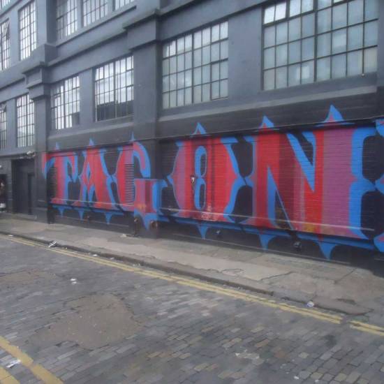 Meanwhile Part 313, a piece painted of a triangular wooden off-cut picked out of a skip outside a Hackney woodwork yard was found hanging where we had left it just off Redchurch Street, we left it there keeping some Ben Eine typography company, it was found and twittered about by a man called Jim this morning. Part 300, painted on a recycled Dior fashion bag and left hanging down in the Leake Tunnel underneath Waterloo outside Diane Goldie’s excellent show last, was found, photographed (in a fancy looking tearoom) and, according yo yet another Twitter posting from the finder, is now by the seaside in Brighton.