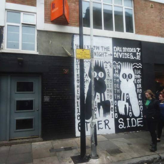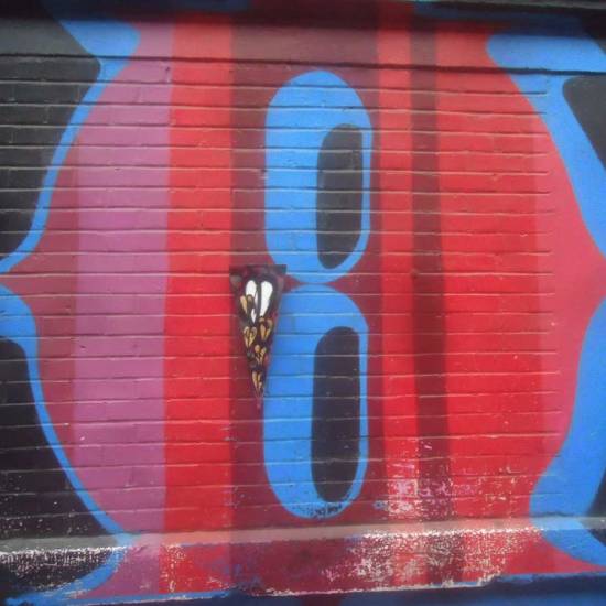 Last weekend more of the parts of the year-long #365ArtDrops piece went out, 315 have been left out on the street to hopefully be found and taken now. Fifty more still to come before the year and the piece both come to an end . We read today, via the hashtag and social media, that Part 312, painted on a sample piece of John Lewis hardwork flooring picked up off the pavement in Hackney, is now on the way to Missouri, USA, we learned of this via the strangely named NoLionsInEngland (well it is social media, people choose the strangest of names), a man who documents street art. Part 312 was hung on Bacon Street, just off Brick Lane, East London, last Sunday. Hung next to a Dscreet owl (that’s how Dscreet spells it, for once that isn’t a typo), appears the piece was found by an American participant in one of East London’s many street art walking tours.