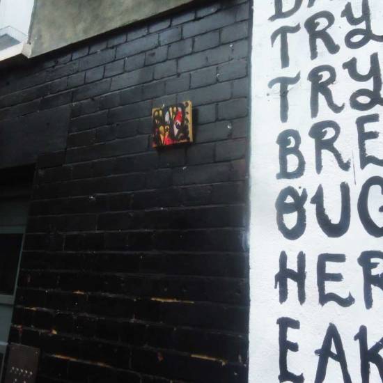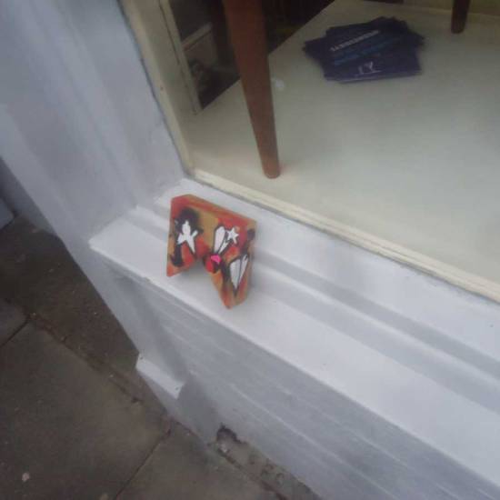 A number of parts of the #365ArtDrops went out over the weekend, pieces painted on found pieces of wood, part 311 was painted on a glittery blue shoe box lid and left keeping a painting of the late Terry Sue Patt company outside Monty’s Bar on Brick Lane, no news on the fate of the glitter show box lid, or the pieces left by the Columbia Road flower market later that afternoon, or the piece left hanging out with Pez on Bash Street (aka Rivington Street) earlier that day. Have you got a piece?