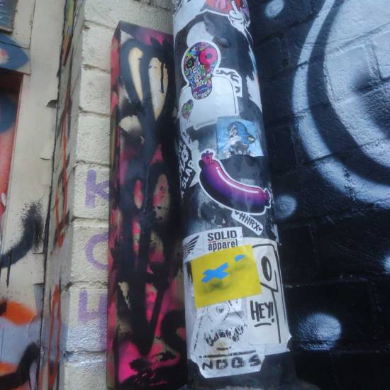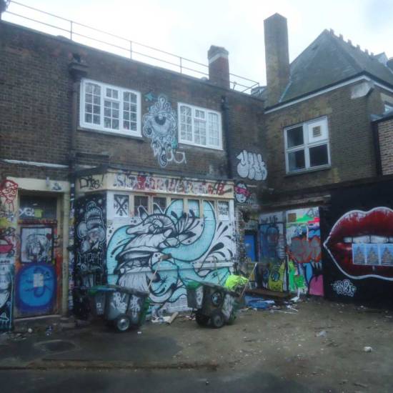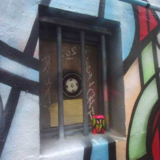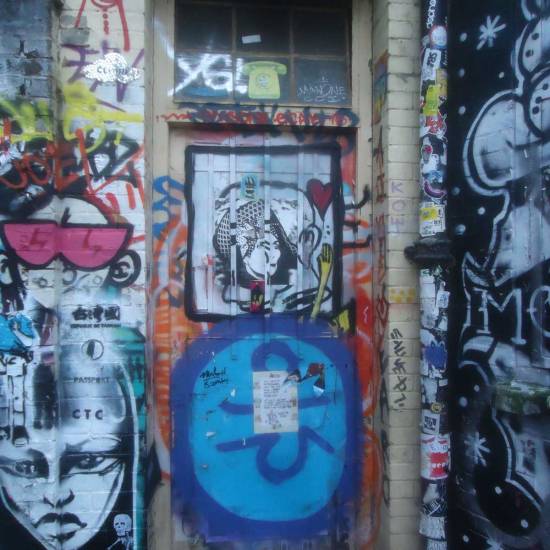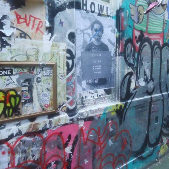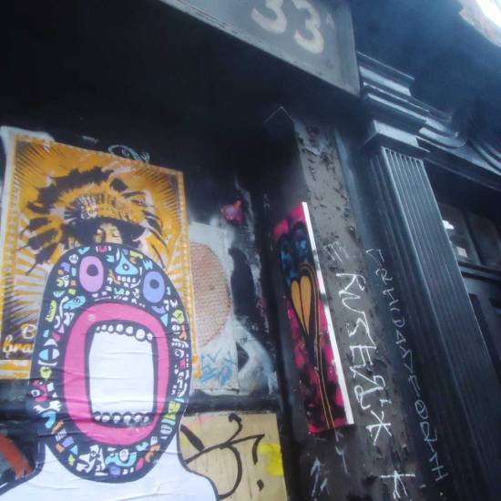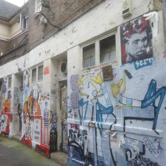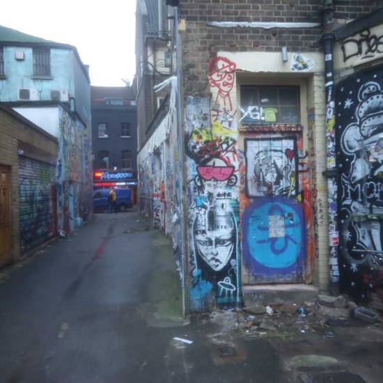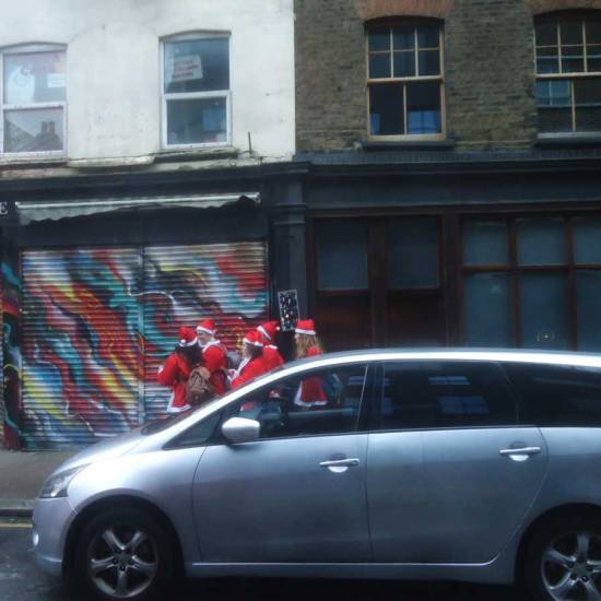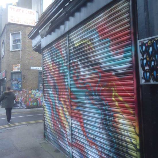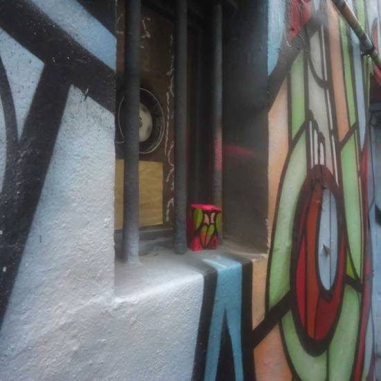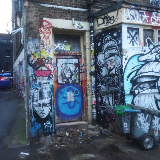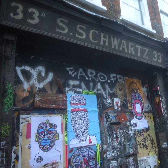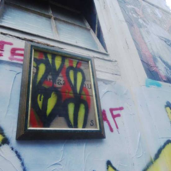 There’s nineteen days left before the year and the year-long piece of work that is the #365ArtDrops comes to some kind of conclusion. There’s 23 parts of the piece to be painted and placed (never dropped, always carefully placed) on the street, 242 pieces out there already and 23 more to go before the piece is complete (well complete in terms of all the parts being out there, not in terms of the interaction and the finding out what happened to the part I suspect) Yesterday’s “drops” mostly happened in a yard just off Brick Lane that was already alive with paint and colour, meanwhile one piece painted on recycled cardboard and put in a found frame, was hung on Redchurch Street (there were a lot of Santa-like creatures on Redchurch Street today) and another piece hung on a gate that lead to what we later discovered to be a rather interesting gateway to a namesake. Two of the pieces placed in the Brick Lane back yard were claimed almost straight away and are now off to spend some time in San Diego, California, a third piece (painted on a found generic “stay calm” canvas print, found in a skip in Hackney and save from landfill), was grabbed almost before it was “dropped”. The piece, painted o a piece of wood found ina recycle bin outside a house on Tudor Road (Hackney) last week was left outside an old place that was once where Schwartz could be found at 33 Fournier Street, not sure who or what Schwartz was or how old that name above the gate is, it looks old but research says there was an Express Dairy sign there in the late 1940s Didn‘t notice the nameplate underneath the painting until the painting had been hung, Fournier street, even by Spitalfields standards has quite a history, Worrall’s yard it seems, is hidden behind that gate….