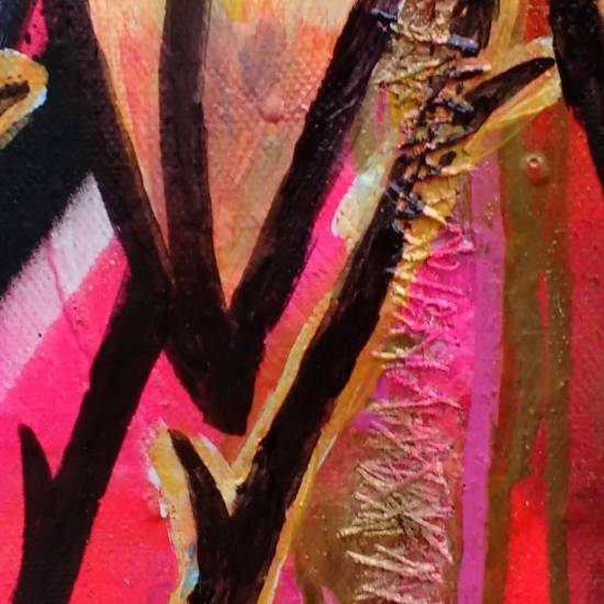 A painting is never finished – “Stitched Thorns, Fresh Layers” (2011-16) – 25cm x 25cm x 4cm- Acrylic, spray paint, market pen, thread, varnish. A painting on a torn and stitched back together box canvas that has evolved over the last five years. A painting is never finished until it is taken away, if it stays here then new leaves and layers and things will grow on it…