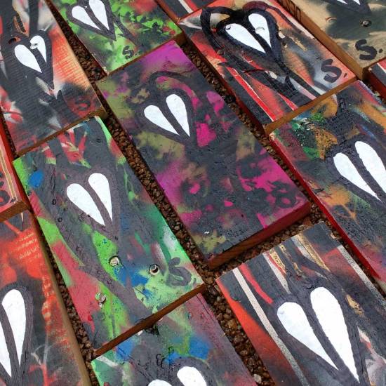 The 43 parts that made up the #43ArtDrop piece were (carefully) hung out on the streets around Hackney Wick, Fish Island and the canal yesterday. Carefully hung, never dropped, that would be careless. A piece of art in 43 parts, all 43 painted on two recycled unwanted wooden pallets picked up off the East London street, painted, and then cut in to 43 parts and painted on some more.