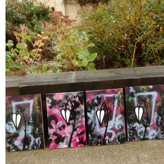 The last four of the Thirteen Shelves, a series of thirteen paintings on found recycled wooden shelves, they evolved a bit more since they were first exclaimed on. The other nine have already been hung on London walls for people to take should they wish to, these last four are ready to join them this weekend.. I see (via the magic of social media), that some of the pieces now have homes…