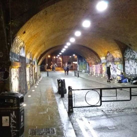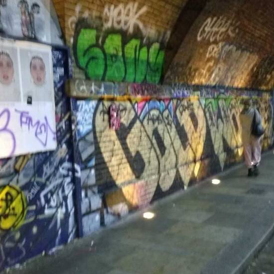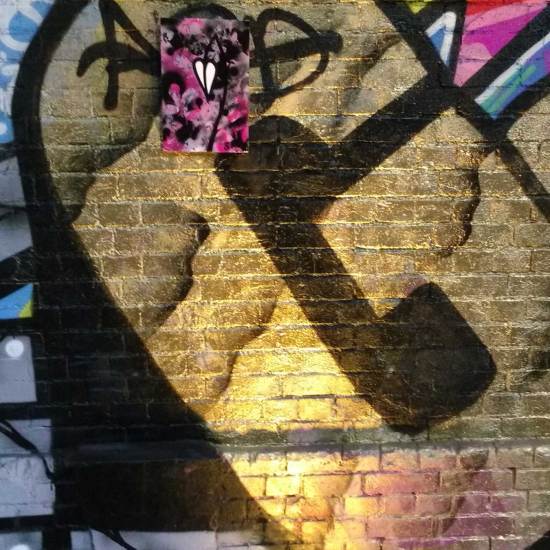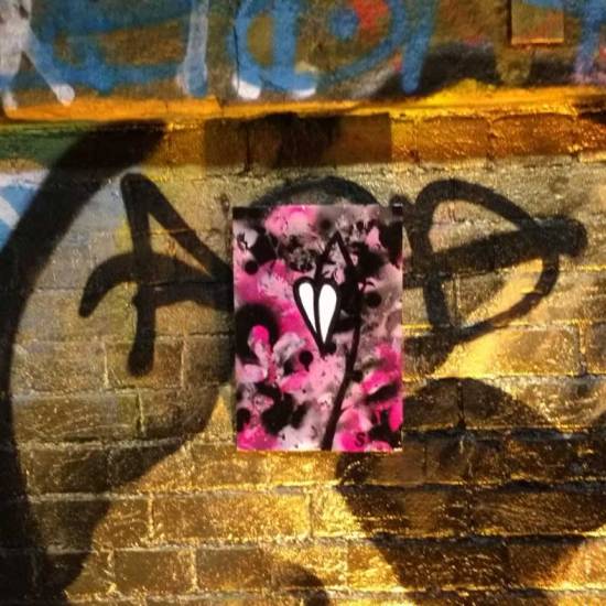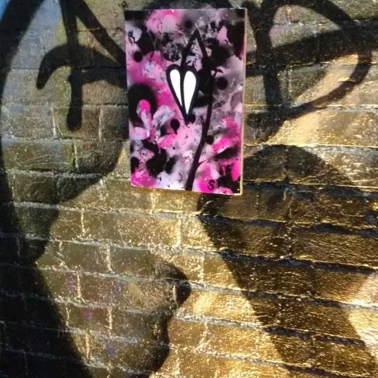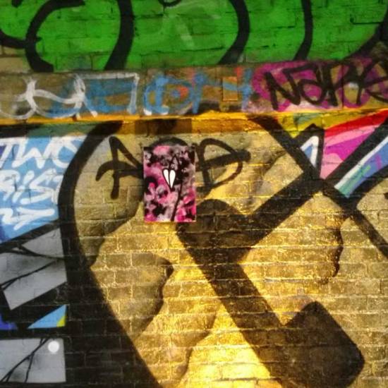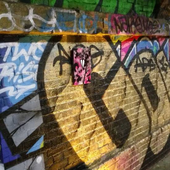 Part six of the Thirteen Shelves piece, thirteen paintings on recycled wooden shelves rescued from a Hackney skip, and left hanging on various East London walls over the last month. Part six eventually, after quite an adventure, ended up hanging in a tunnel by Shoreditch railway station. And today we see, via the magic of social media, that the piece now has a home….