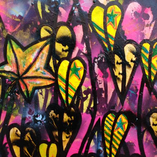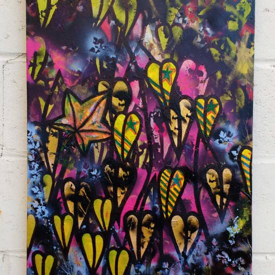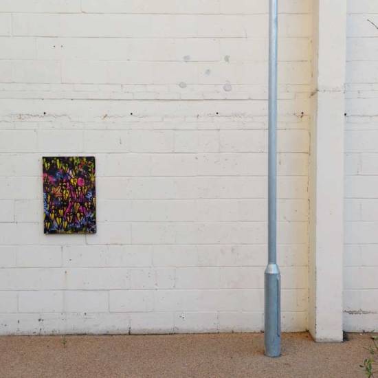 A Leaf, (2016) – Acrylic, spray paint, gloss varnish 105cm x 45cm, painted on board, in gold frame and under glass.