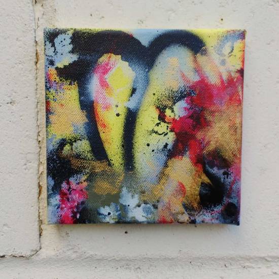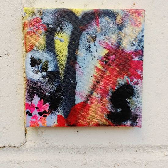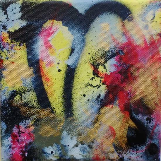 “Two leaves” – The notion of a painting brought to a finished state every day of the year during 2017. Fresh leaf growth on a small square canvas. Acrylic, spray paint, brush work, gold paint, varnish on canvas 15cm x 15cm x 1cm. The 22nd painting of 2017.