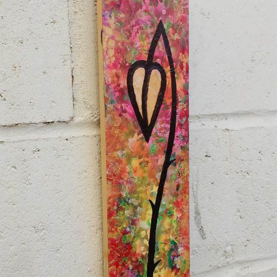 24/365 “Sometimes They Have Herb Robert” – The notion of a painting brought to a finished state every day of the year during 2017. Fresh leaf growth on a recycled wooden plank picked up off the street. Acrylic, spray paint, brush work, gold paint, marker pen, varnish on wood 46cm x 12cm. The 24th painting of 2017. SOLD