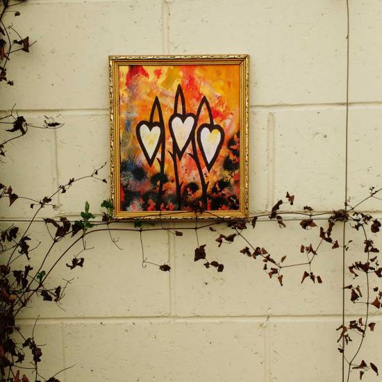 Piece number two is a “Sometimes They Have Thorns” Canvas piece painted back in 2016, one in a numbered series on 43 small canvases, this one is number 32 – acrylic, brush work, marker pen, varnish, 15cm x 15cm x 1cm…
