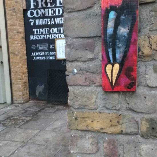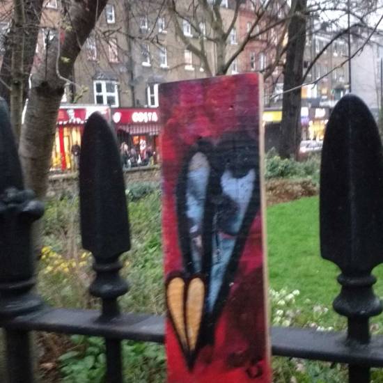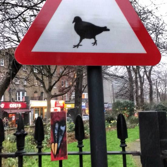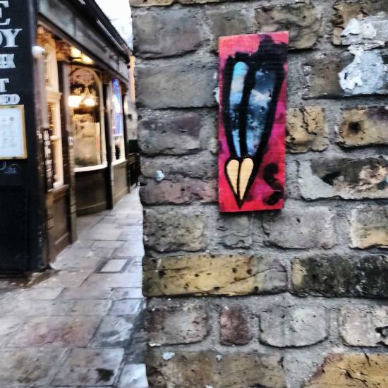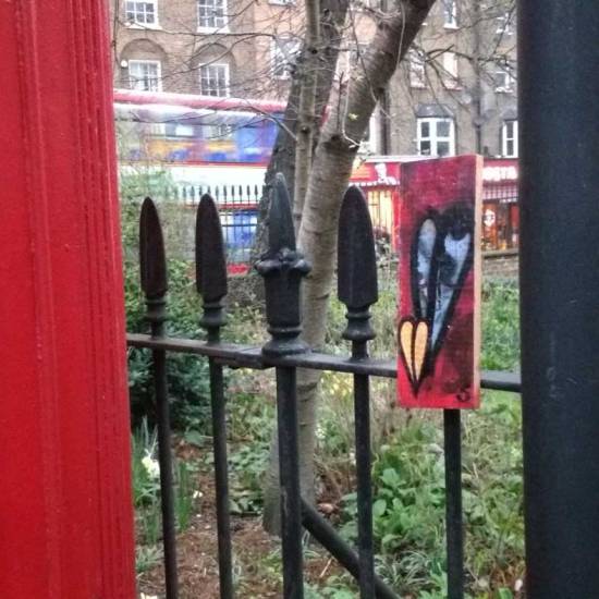 Leaves left and that New Year resolution not to art drop finally broken. The first art drop since December 31st happened yesterday, leaves left in the Spring light, I did say I would never do it again. Two pieces were left hanging on a wall and a fence, both in Islington, hanging there waiting to be taken should someone wish to, two pieces painted on some found recycled wood and left hanging in North London, two of the 70 pieces brought to a conclusion so far in the first 70 days of 2017 as the notion of a painting brought to a conclusion on every single day of 2017. And now the resolution has been broken I imagine there will be more carefully placed “drops” as the spring kicks in, there is a certain pleasure in painting on something picked up off the street or found in a skip and putting it back out there…