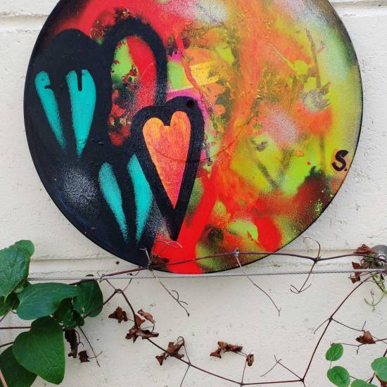 108/365 – Fresh Leaf Growth on a 12″ Record, April 18th Fresh growth, new layers, leaves and the ongoing notion of a smaller painting brought to a completed conclusion on every single day of 2017. On day 108, a 108th piece, acrylic, spray paint, brushwork, marker pen, varnish on a recycled 12″ vinyl record.