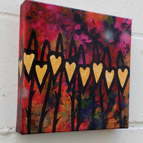 123/365 – Fresh Leaf Growth, May 3rd Fresh growth, new layers, leaves and the ongoing notion of a smaller painting brought to a completed conclusion on every single day of 2017. On day 123, a 123rd piece, acrylic, spray paint, brushwork, marker pen, varnish on canvas , 15cm x 15cm