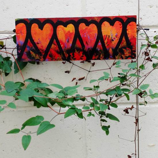 117/365 – Fresh Leaf Growth, April 27th Fresh growth, new layers, leaves and the ongoing notion of a smaller painting brought to a completed conclusion on every single day of 2017. On day 117, a 117th piece, acrylic, spray paint, brushwork, marker pen, varnish on a recycled found piece of hardwood, 9cm x 31cm.
