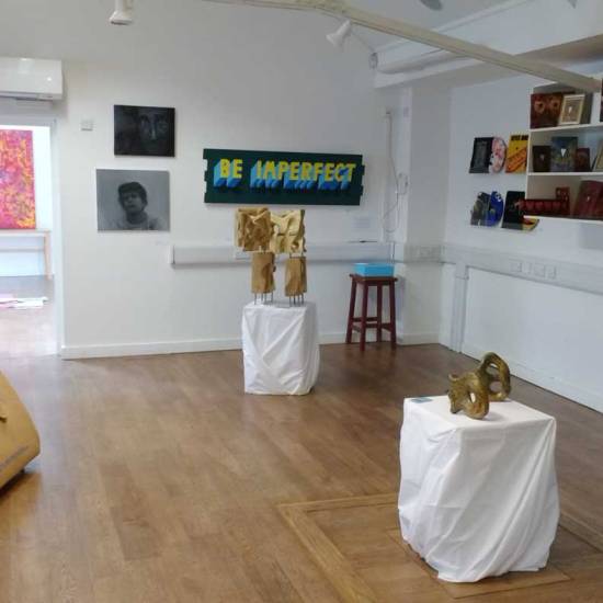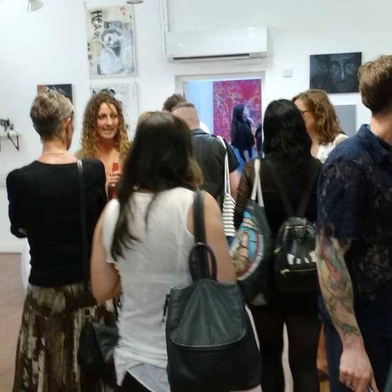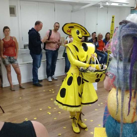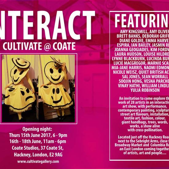 And so Interact happened, a Cultivate takeover of Coate Studios and an art show in the two big rooms of the space just off the Hackney Road, London E2. Twenty-eight painters, performers, sculptors, textile artists, print makers, wallpaper printers and more and show pulled together by myself and co-cultivator Emma Harvey. There’s a collection of thoughts, words and a lot more photos of the work of the other artists as well as the crowds from the opening night over on the Organ pages – Sir Ian McKellen eating a pasty, a giant yellow emoticon and a whole lot of art, paint, interaction and more… there’s also lot of photos of the work of all twenty-eight artists over on the Cultivate website – Interact, a flavour of the work of all twenty-eight artists, gallery shots without all the people and the pastry eating… There’s plenty of thought in terms of the show, the curation, the way it worked, the art of the other artists and more via those two reviews, I expect there will be more though on the Cultivate website over the next few days and weeks. I think we can say the show went well, exciting art, lots of people, excellent performance and well, more on the Cultivate pages if you want to explore.