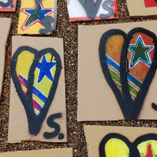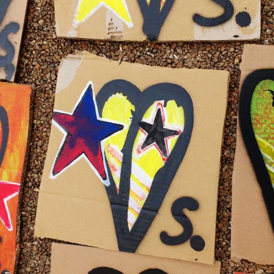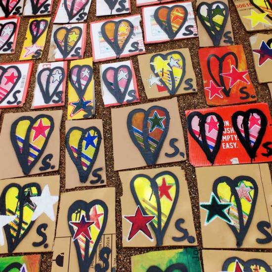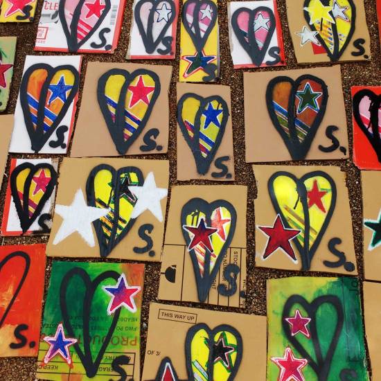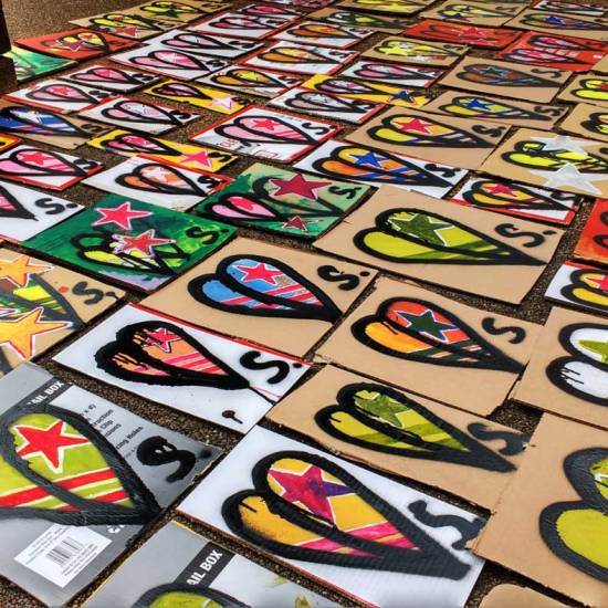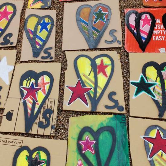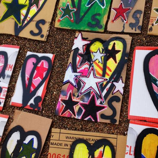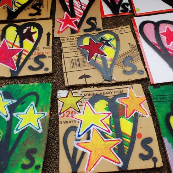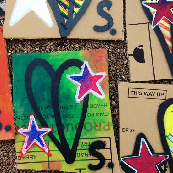 It has now become quite a tradition to produce a One Hundred Pieced Piece for the London leg of the Art Car Boot Fair. A piece of work in one hundred parts, one hundred rather fast pop art flavoured paintings painted on recycled cardboard, each part of the piece for sale at just £1, and that is a very important part of the piece, the notion of art for everyone, that an original piece of art can be bought by anyone at the fair (I did get haggled down to 50p last year by one young lad who claimed he only had £1 left) and that material thrown away and heading for landfill should be re-used. And really if people are just going to throw things away without too much thought then leaves will grow on those thrown away things.