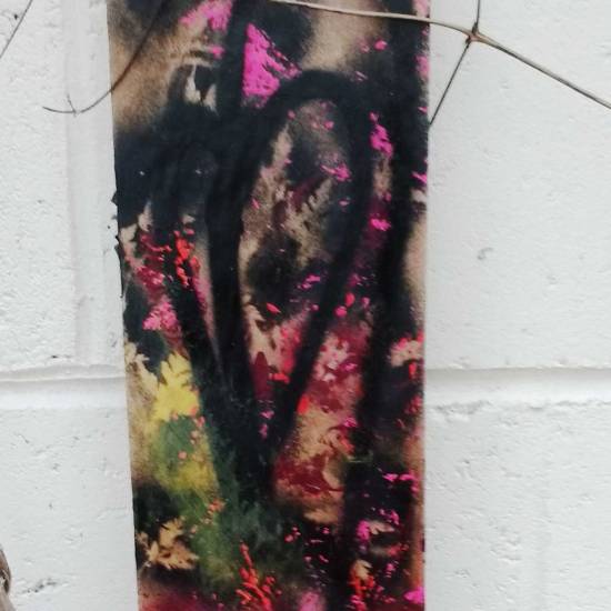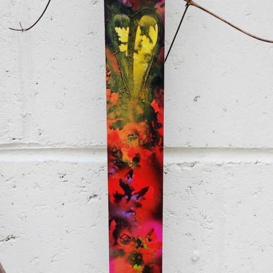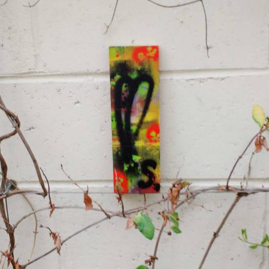 174/365 – Fresh Leaf Growth, June 23rd Fresh growth, new layers, leaves and the ongoing notion of a smaller painting brought to a completed conclusion on every single day of 2017. On day 174, a 174th piece, acrylic, brushwork, marker pen, spray paint, varnish on a found piece of wood
