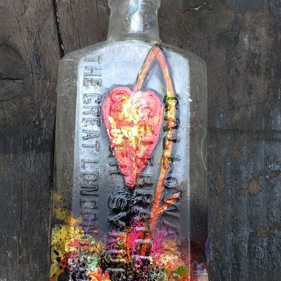 172/365 – Fresh Leaf Growth, June 21st Fresh growth, new layers, leaves and the ongoing notion of a smaller painting brought to a completed conclusion on every single day of 2017. On day 172, a 172nd piece, acrylic, brushwork, spray paint, varnish on a found antique glass bottle