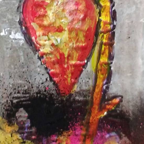 155/365 – Fresh Leaf Growth, June 4th Fresh growth, new layers, leaves and the ongoing notion of a smaller painting brought to a completed conclusion on every single day of 2017. On day 155, a 155th piece, acrylic, marker pen, brushwork, spray paint, varnish on a piece of found cardboard